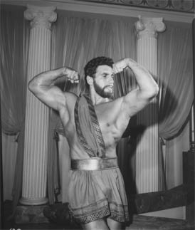 As part of the promotion for the film, these photos of Samson (holding a comb) were shot for an Ace Comb "Tie Up". Ace hair combs were marketed under the slogan "So strong, even Hercules can't break them!" |